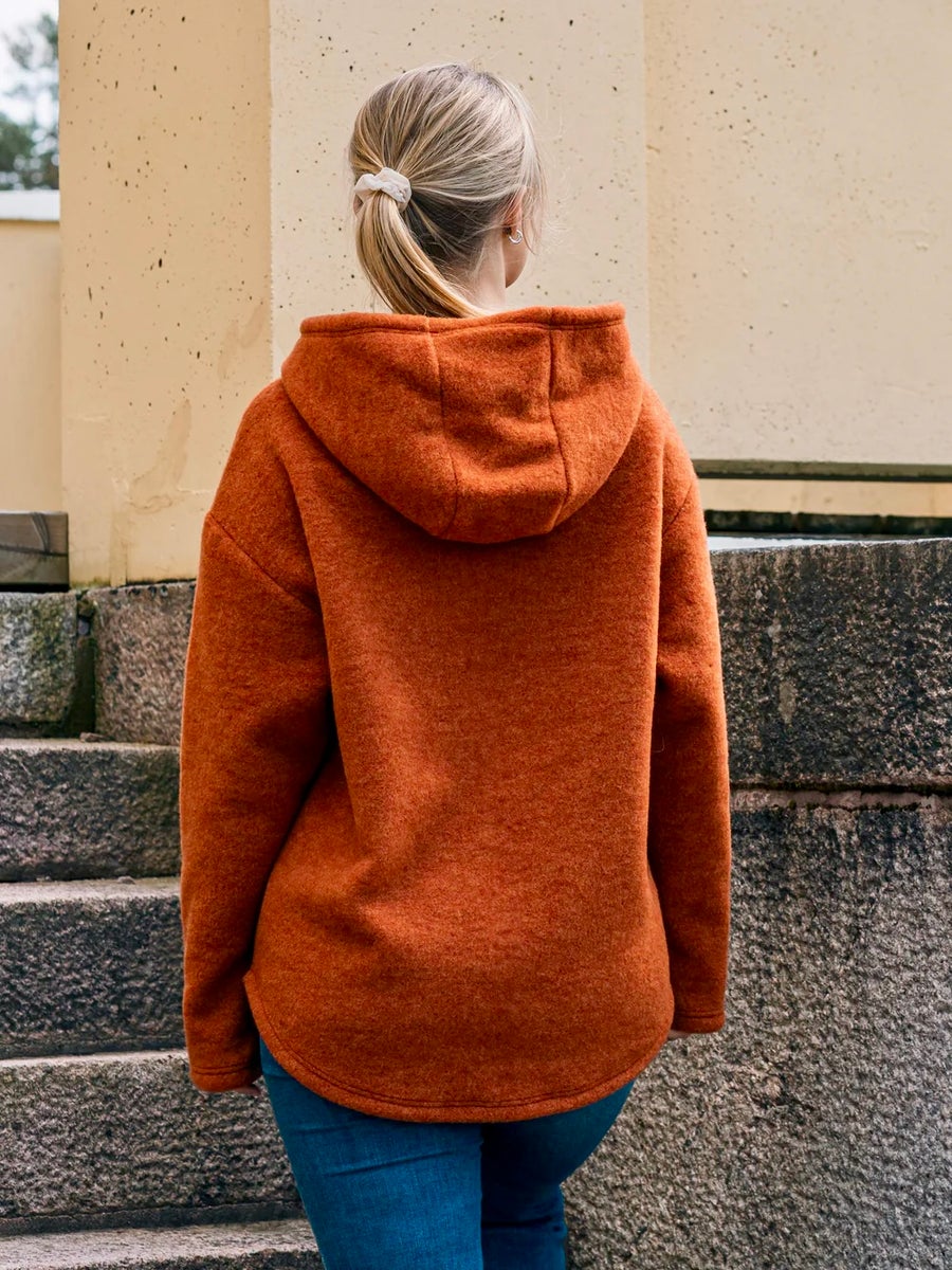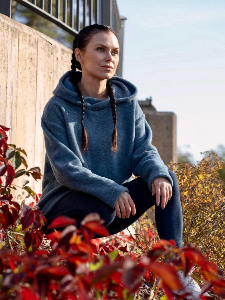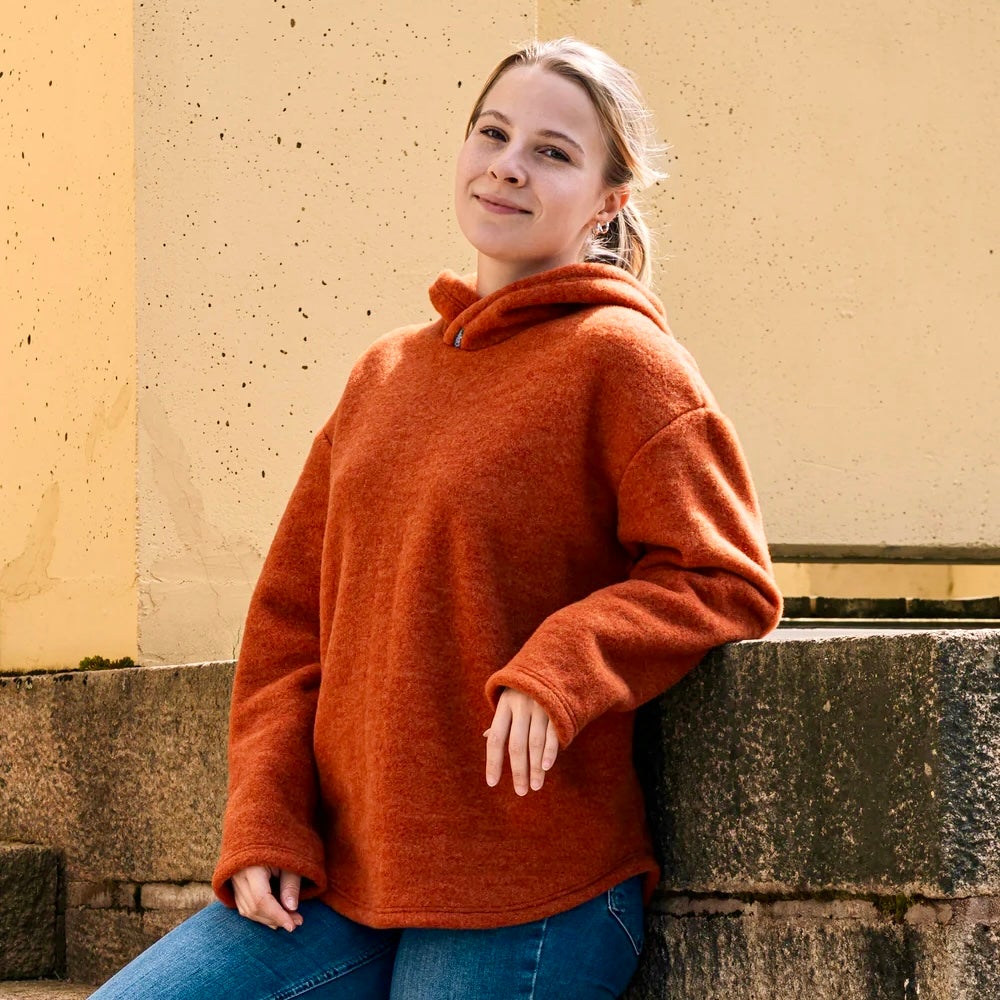 Monikäyttöinen, luomumerinovillasta valmistettu huppari sopii hyvin kerrospukeutumiseen ja tuo lisälämpöä ympäri vuoden niin kotona, metsäpoluilla kuin kaupungissakin. Molemmin puolin pehmeäksi harjattu ekologinen merinovillaneulos tuntuu miellyttävältä jopa paljasta ihoa vasten.