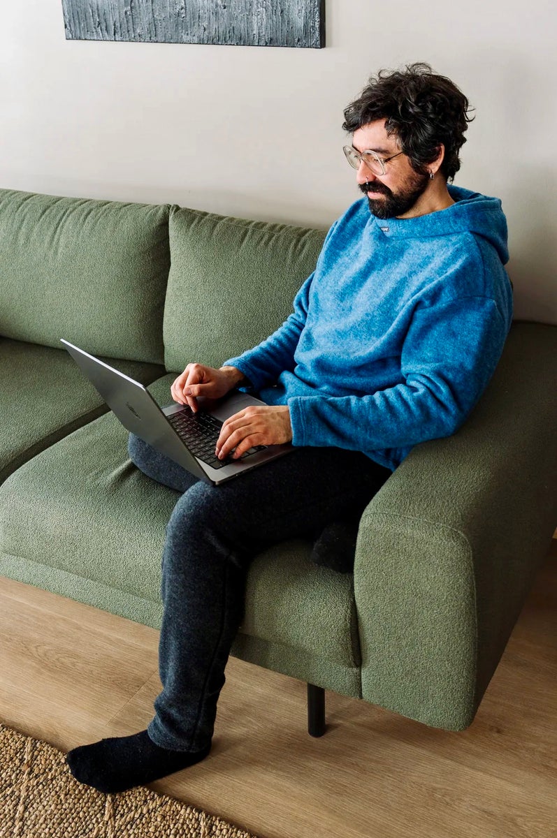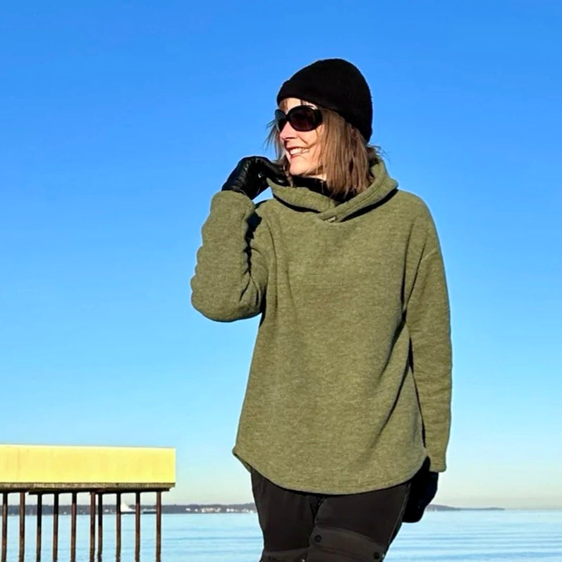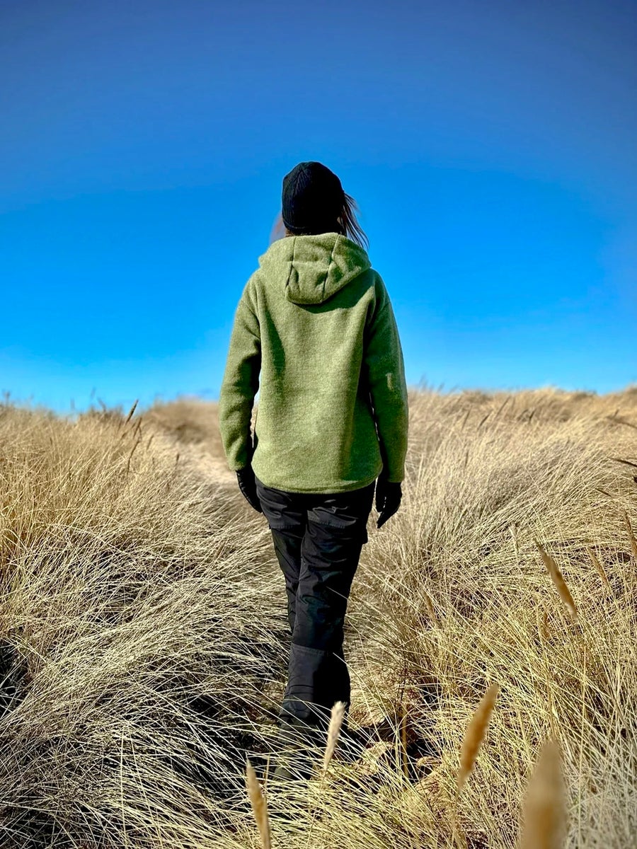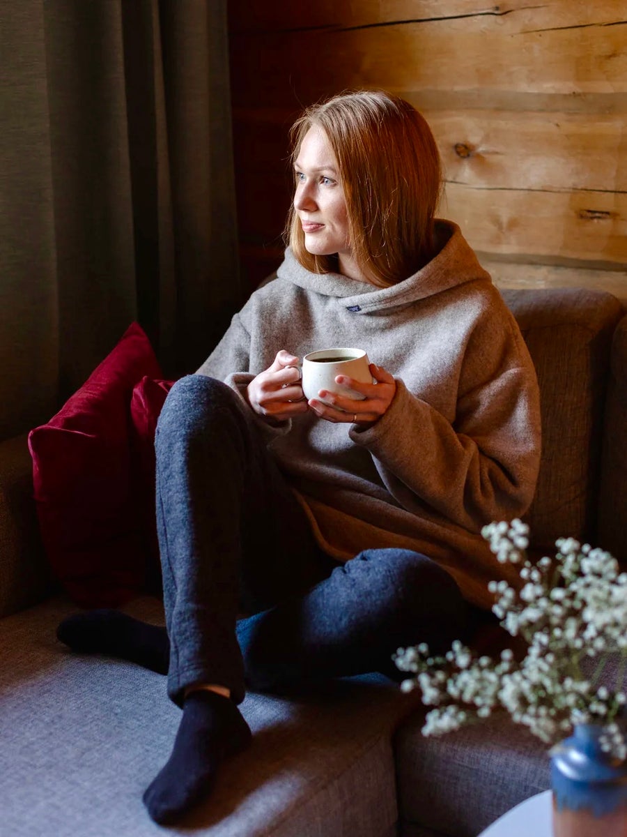 Monikäyttöinen, luomumerinovillasta valmistettu huppari sopii hyvin kerrospukeutumiseen ja tuo lisälämpöä ympäri vuoden niin kotona, metsäpoluilla kuin kaupungissakin. Molemmin puolin pehmeäksi harjattu ekologinen merinovillaneulos tuntuu miellyttävältä jopa paljasta ihoa vasten.